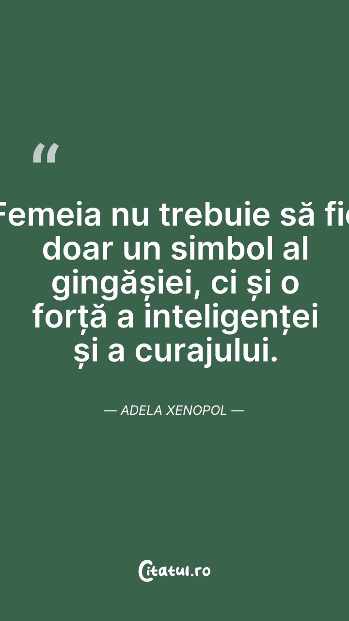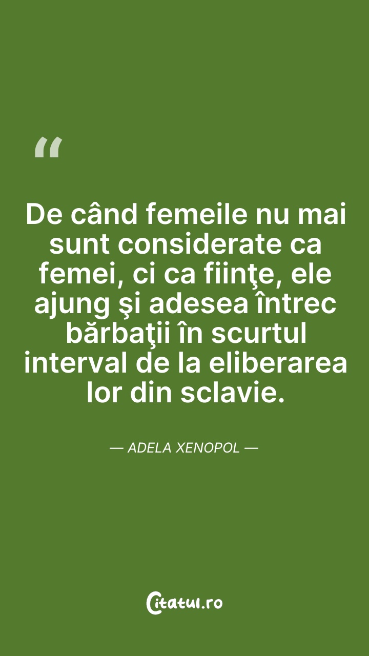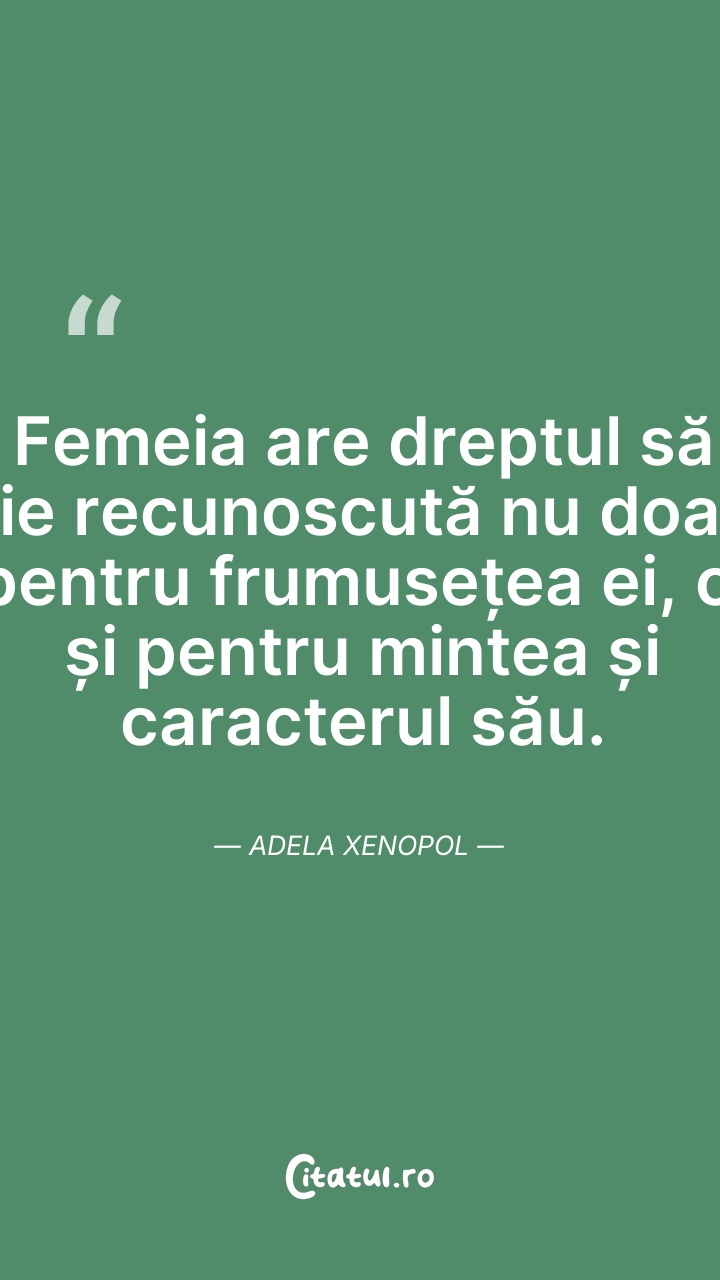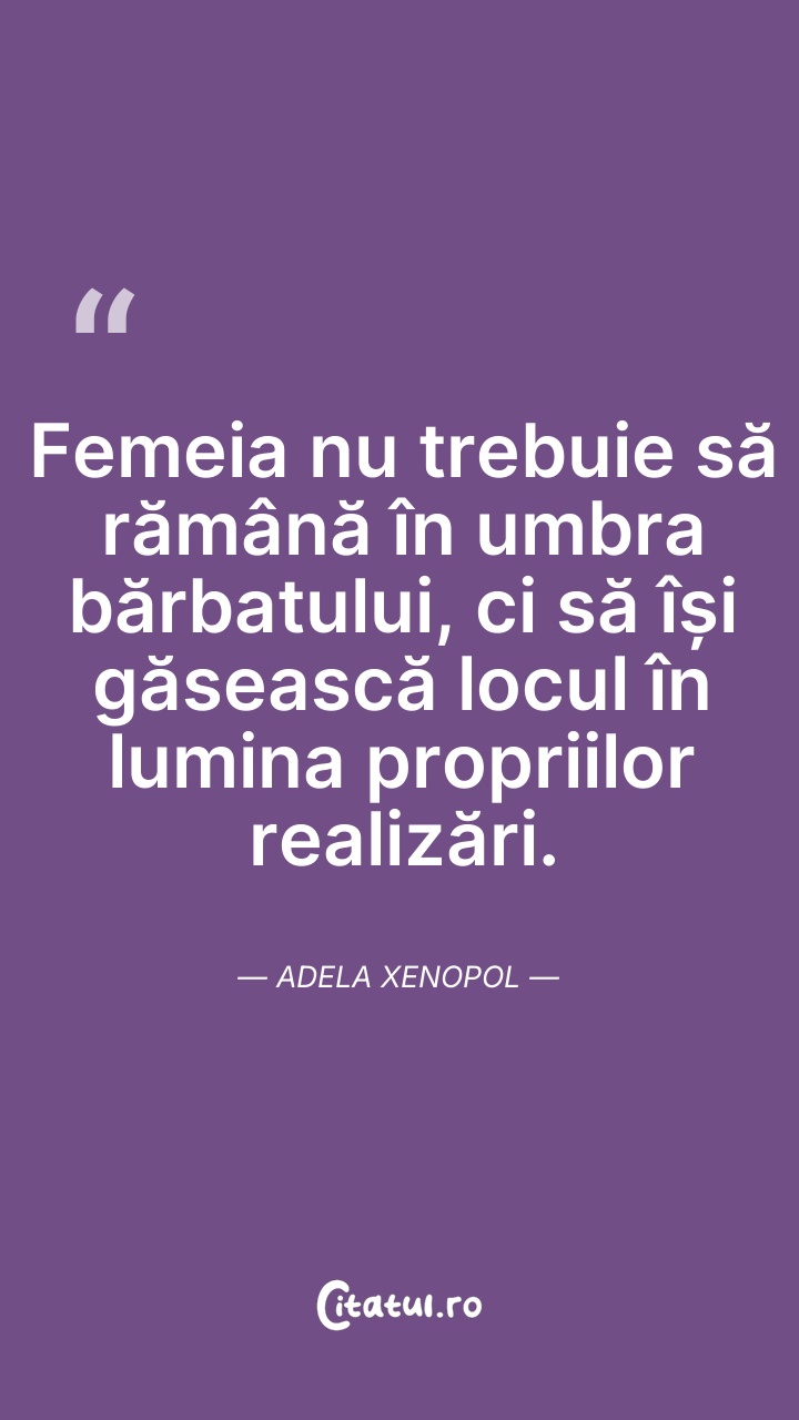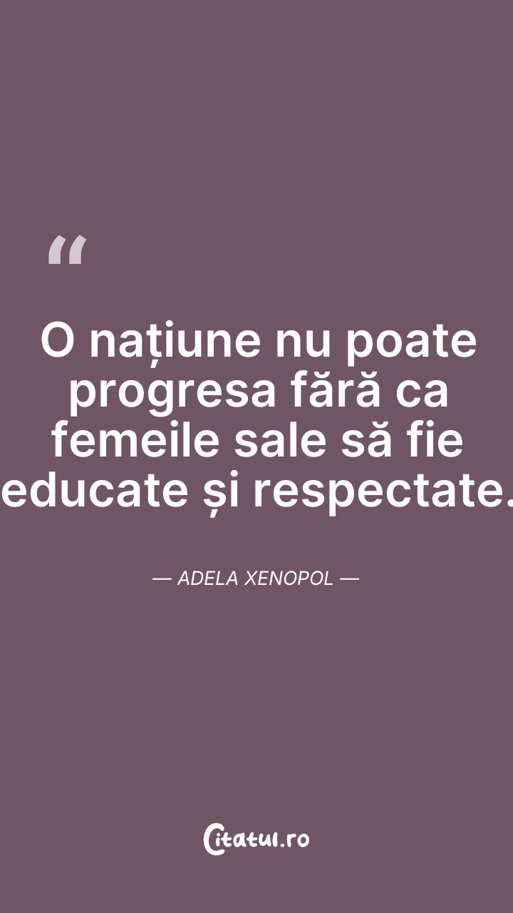 Adela Xenopol a fost o scriitoare, prozatoare și autoare română. A publicat atât literatură, cât și broșuri feministe, fiind fondatoarea mai multor reviste, anume „Dochia” (1896-1898), „Românca” (1905-1906), „Viitorul româncelor” (1912-1916) și „Revista scriitoarei” (1926-1928). În 1914, cu puțin înaintea izbucnirii Primului Război Mondial, a prezentat împreună cu alte feministe în fața Parlamentului Român o petiție privind sufragiul femeilor. În 1925 a fondat Societatea Scriitoarelor Române pentru a încuraja femeile să publice mai mult. În anul următor a fondat Revista scriitoarei, jurnal cu o influență majoră în diseminarea textelor feministe.