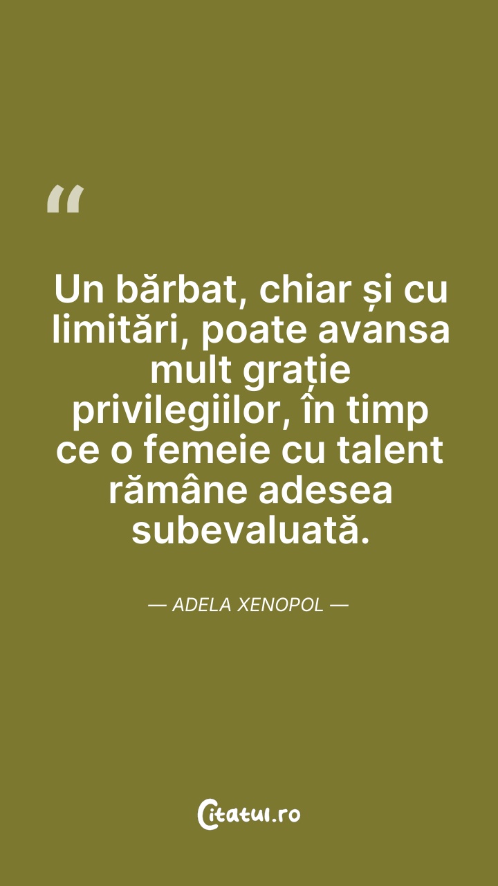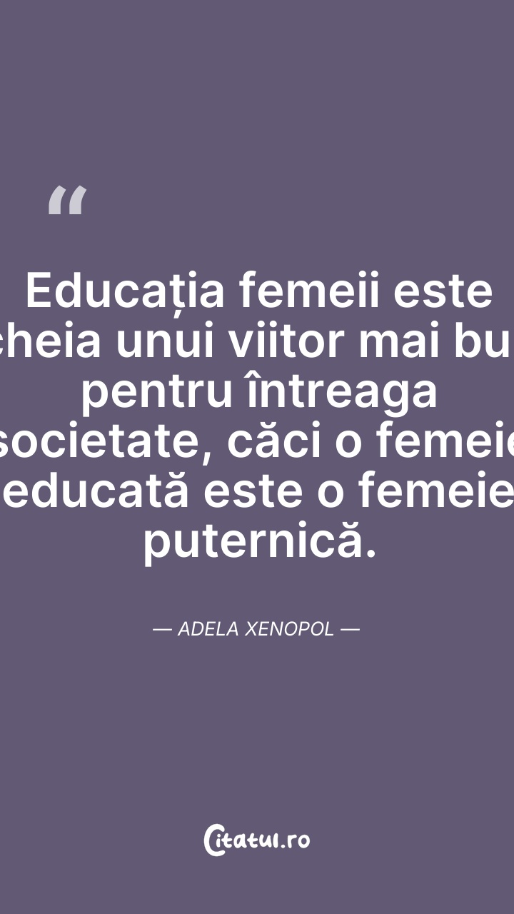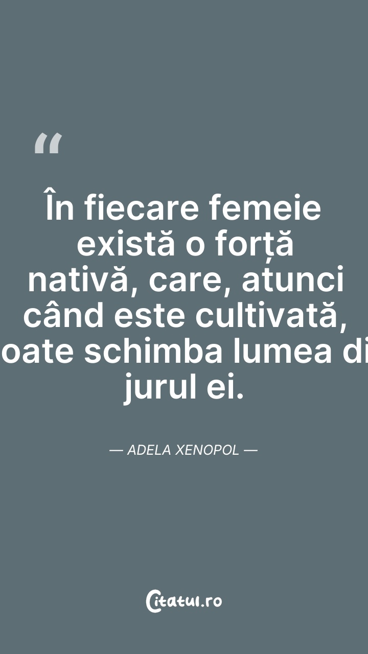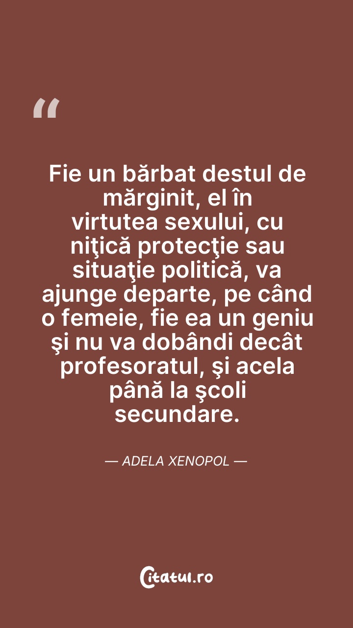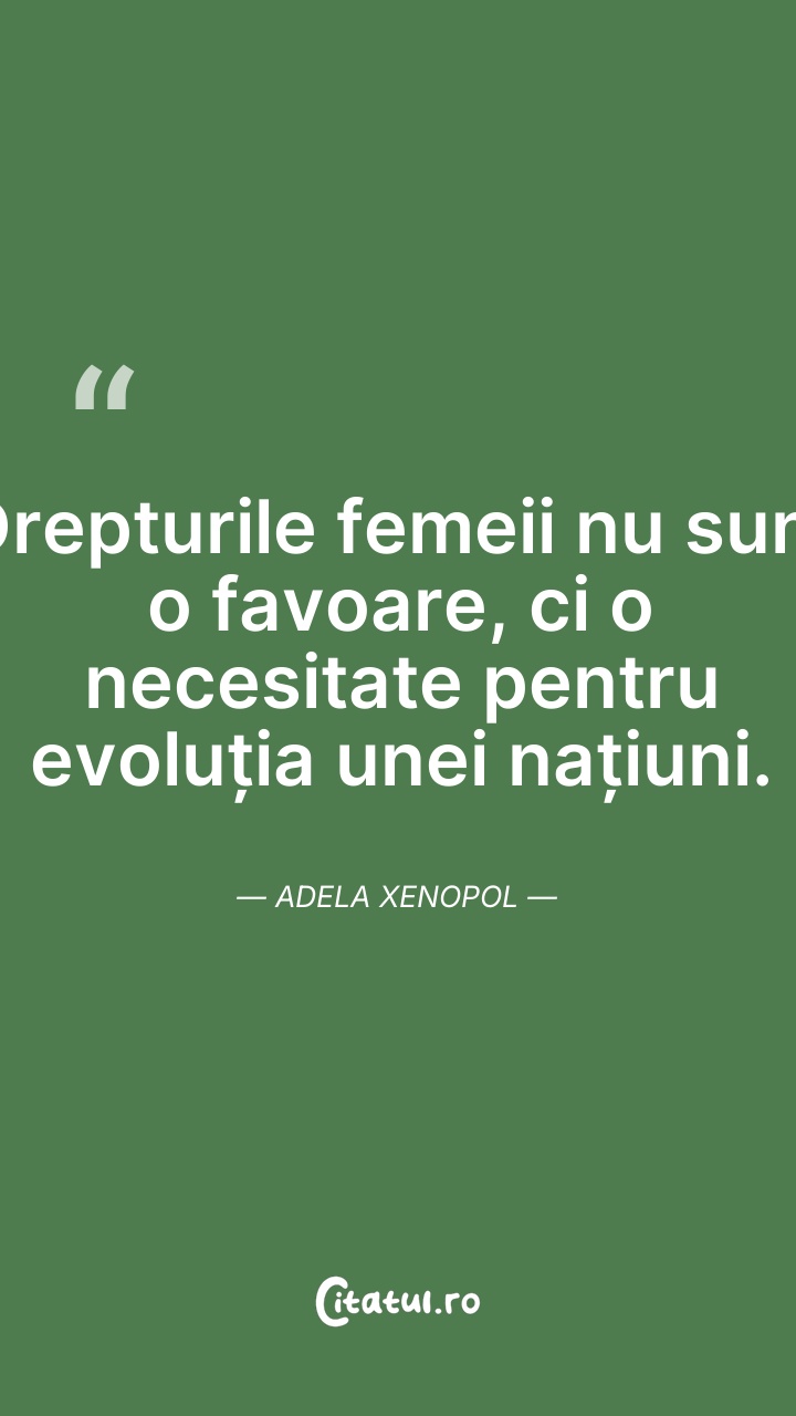 Adela Xenopol a fost o scriitoare, prozatoare și autoare română. A publicat atât literatură, cât și broșuri feministe, fiind fondatoarea mai multor reviste, anume „Dochia” (1896-1898), „Românca” (1905-1906), „Viitorul româncelor” (1912-1916) și „Revista scriitoarei” (1926-1928). În 1914, cu puțin înaintea izbucnirii Primului Război Mondial, a prezentat împreună cu alte feministe în fața Parlamentului Român o petiție privind sufragiul femeilor. În 1925 a fondat Societatea Scriitoarelor Române pentru a încuraja femeile să publice mai mult. În anul următor a fondat Revista scriitoarei, jurnal cu o influență majoră în diseminarea textelor feministe.