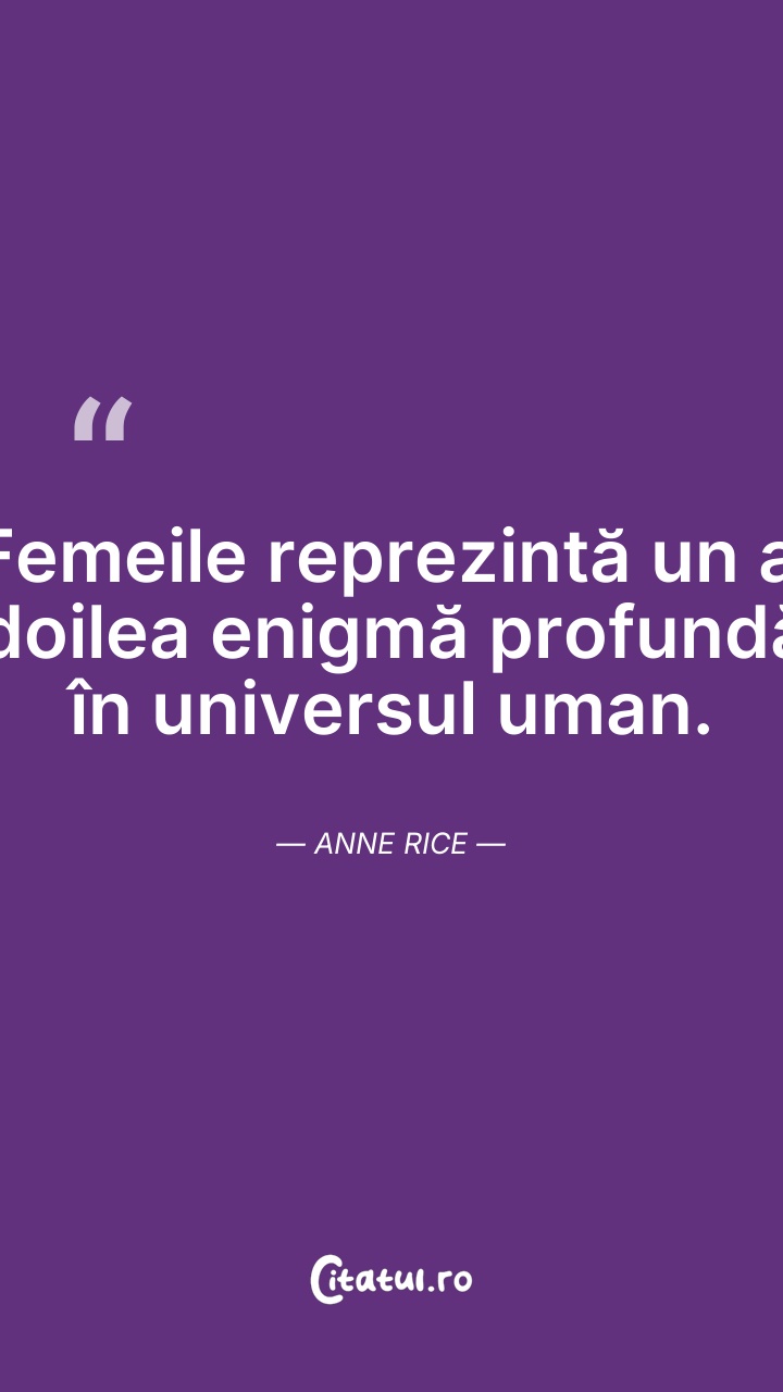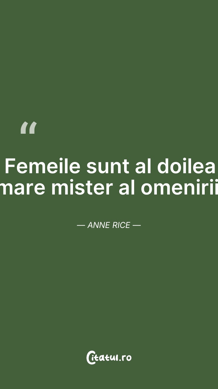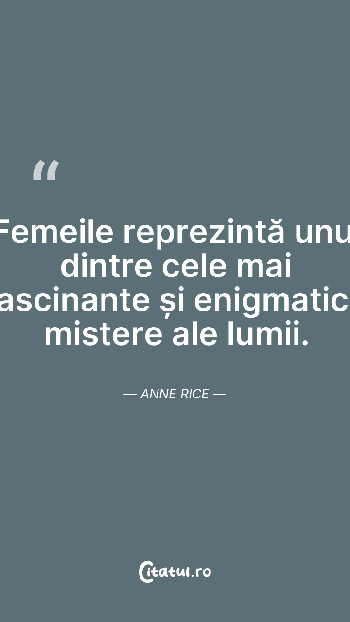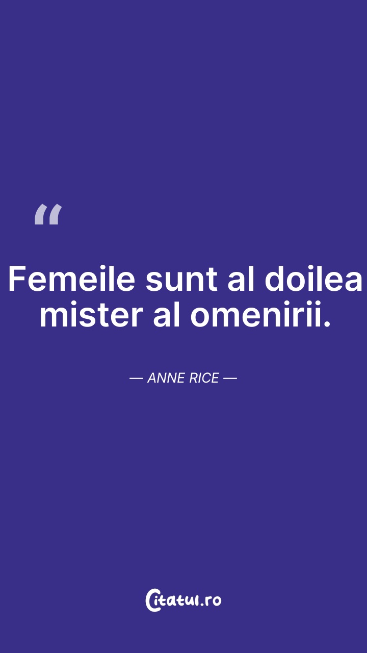 Anne Rice, a fost o scriitoare americană de romane și nuvele gotice și mai târziu religioase. Este cunoscută în principal pentru seria Cronicile vampirilor, care are ca teme dragostea, moartea, nemurirea, existențialismul și condiția umană. A fost căsătorită cu poetul Stan Rice până la moartea acestuia în 2002. Cărțile ei s-au vândut în aproape 100 de milioane de copii, făcând-o una dintre cele mai citite autoare din istorie.