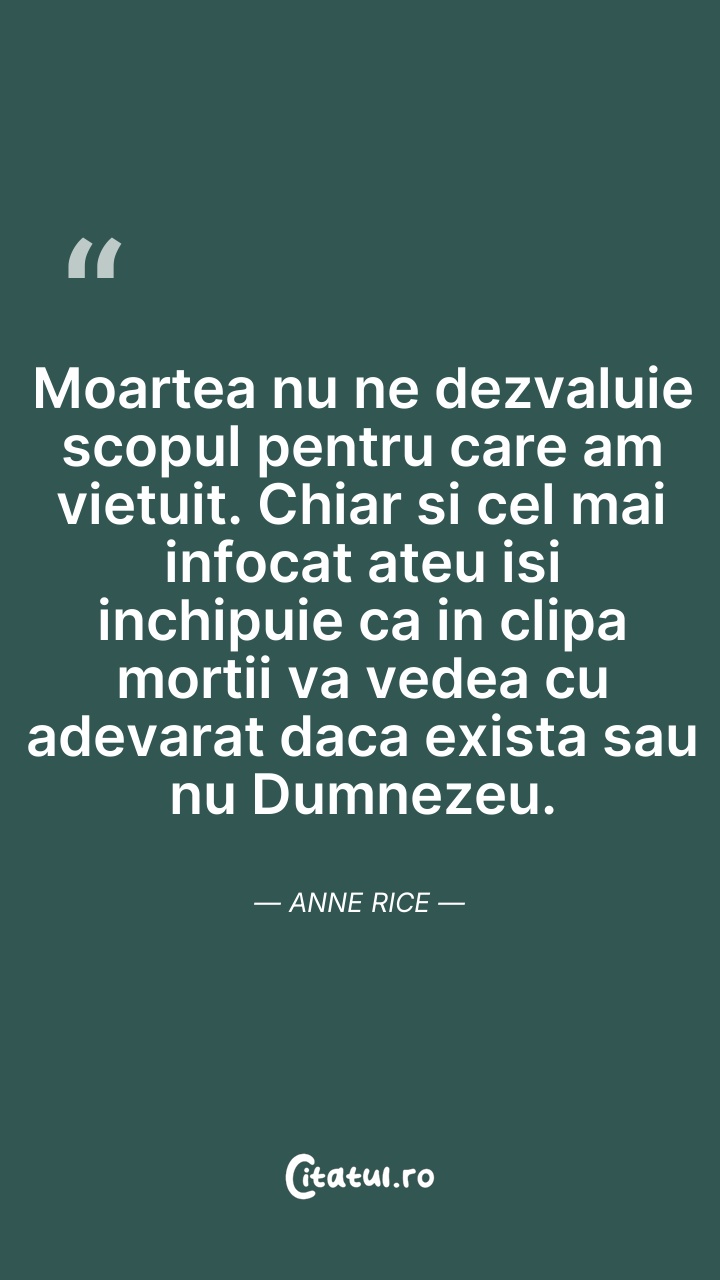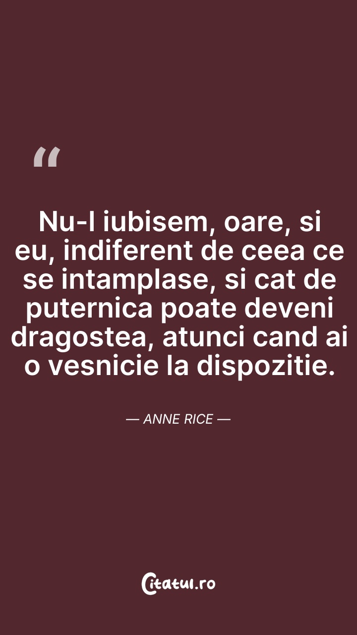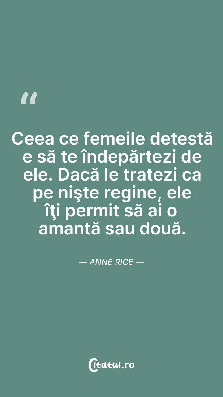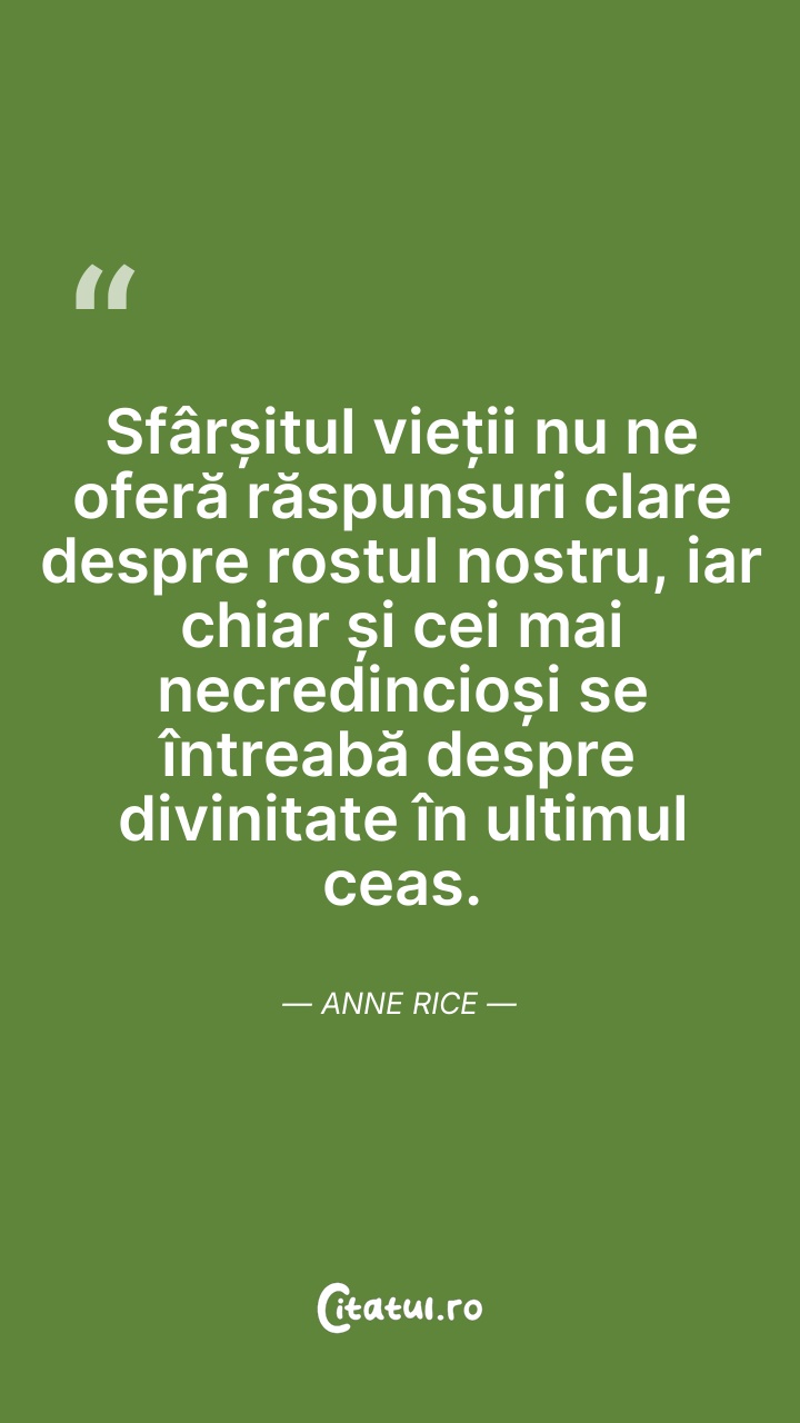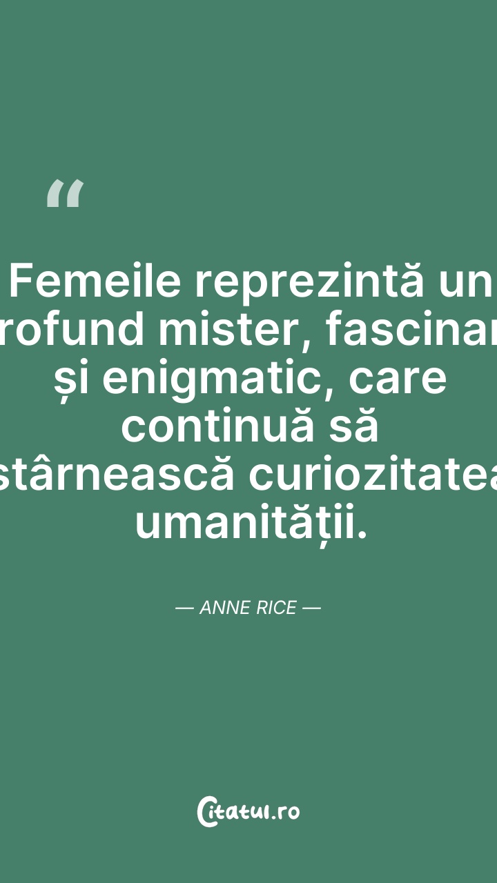 Anne Rice, a fost o scriitoare americană de romane și nuvele gotice și mai târziu religioase. Este cunoscută în principal pentru seria Cronicile vampirilor, care are ca teme dragostea, moartea, nemurirea, existențialismul și condiția umană. A fost căsătorită cu poetul Stan Rice până la moartea acestuia în 2002. Cărțile ei s-au vândut în aproape 100 de milioane de copii, făcând-o una dintre cele mai citite autoare din istorie.