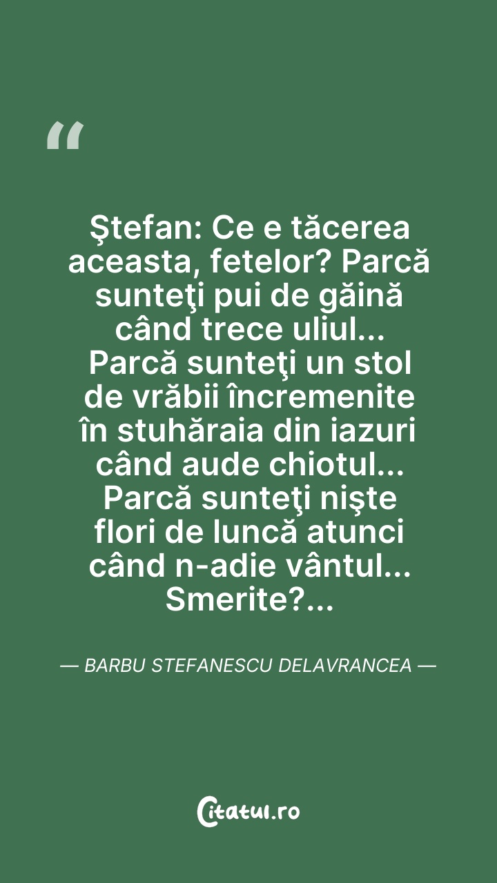 Ştefan: Ce e tăcerea aceasta, fetelor? Parcă ... Citește tot citatul >