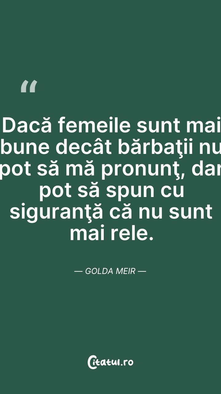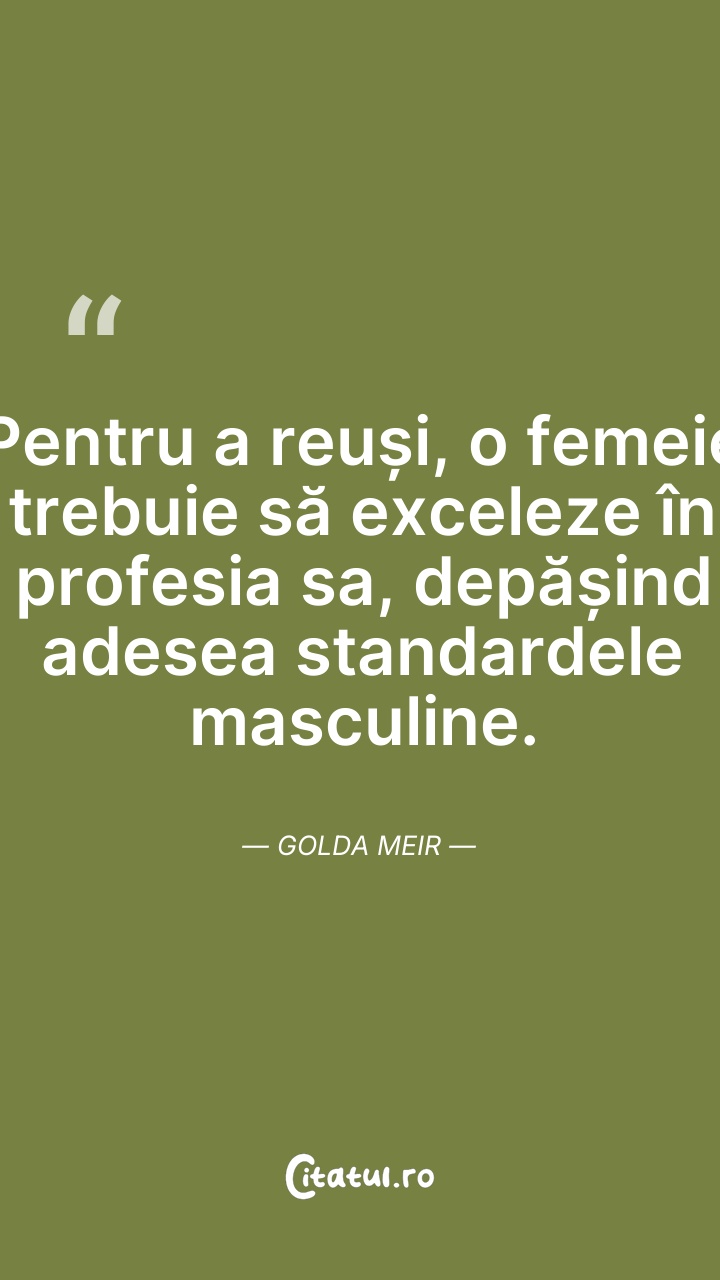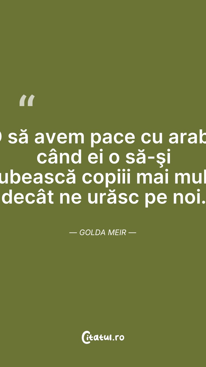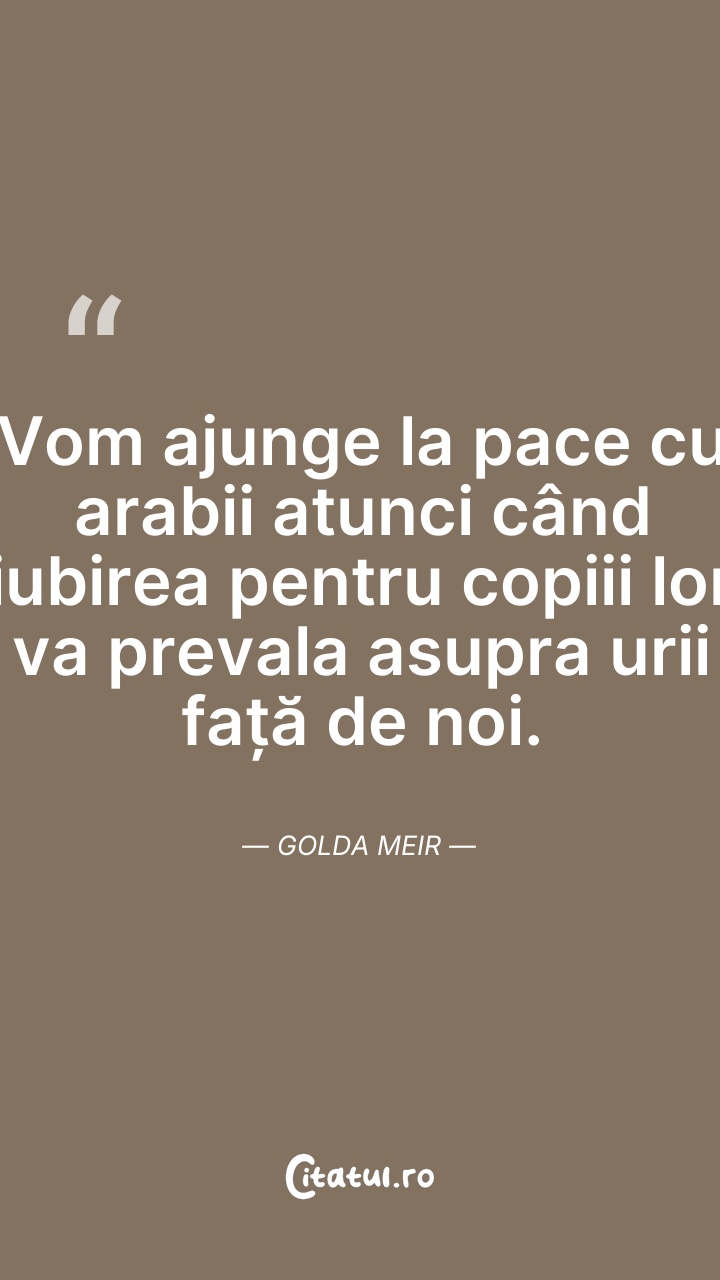 Golda Meir, născută Golda Mabovici, între 1917-1956 Golda Meyerson a fost politiciană social-democrată israeliană, al patrulea prim-ministru al statului Israel. Meir a fost aleasă prim ministru al Israelului la 17 martie 1969, după ce servise ca ministru de externe. A fost prima femeie din Israel și a treia din lume care a ocupat funcția de șefă de guvern.