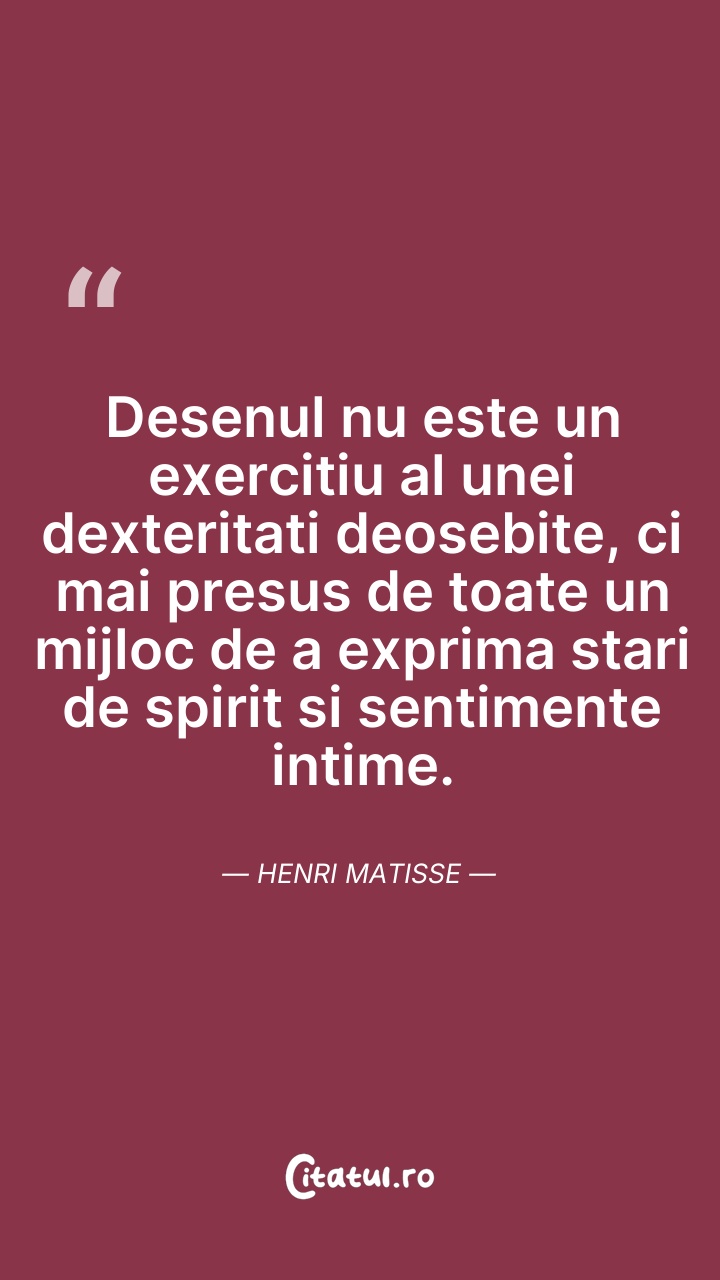 Henri Matisse, pictor francez, unul dintre cei mai străluciți reprezentanți ai artei secolului al XX-lea și totodată unul dintre principalii inițiatori ai artei moderne. Moștenitor al impresionismului și neoimpresionismului, Matisse dă impuls mișcării fauviste, dar este în același timp un pictor universal, la fel de dezinvolt în cultivarea artei africane, cât și în creația artiștilor renascentiști sau cu operele contemporanilor săi.
