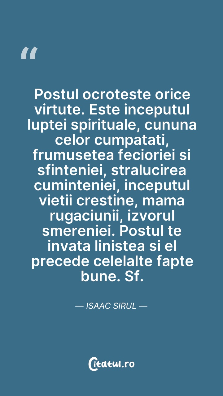 Postul ocroteste orice virtute. Este inceputu ... Citește tot citatul >