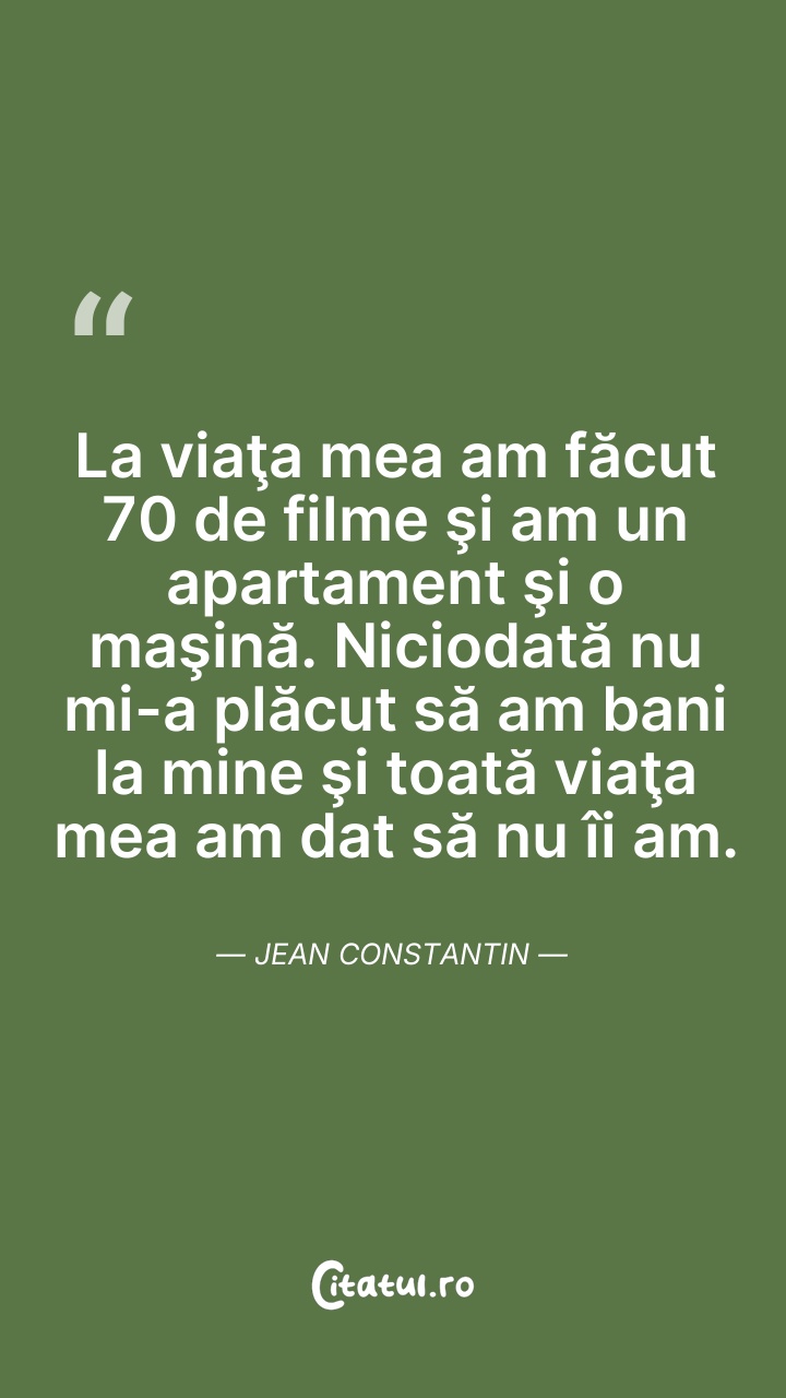 Jean Constantin a fost un actor român de film, estradă, radio, televiziune, scenă, voce și vodevil, care a excelat în roluri comice, considerat „maestrul comediei”. Printre personajele memorabile întruchipate de Constantin se numără cele din seria B.D., filmele de acțiune și de comedie ale regizorului Sergiu Nicolaescu și bucătarul Ismail din serialul de televiziune Toate pânzele sus (1976).