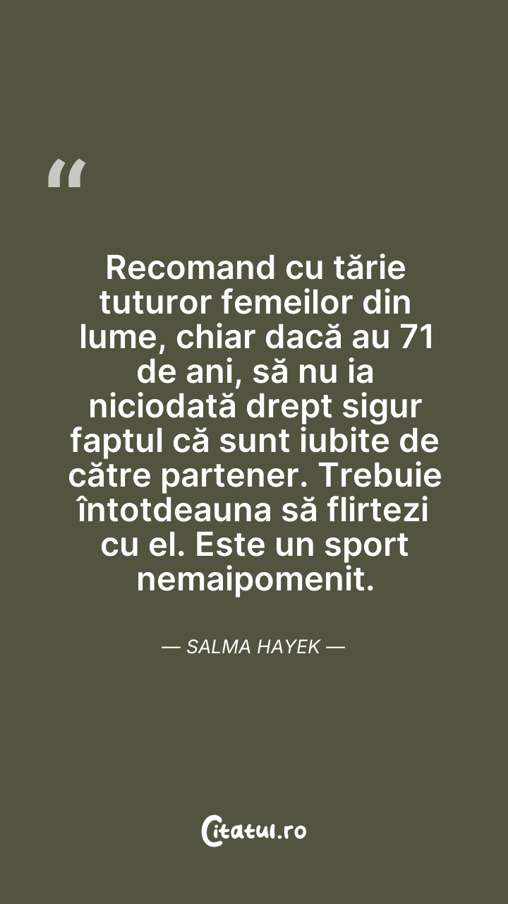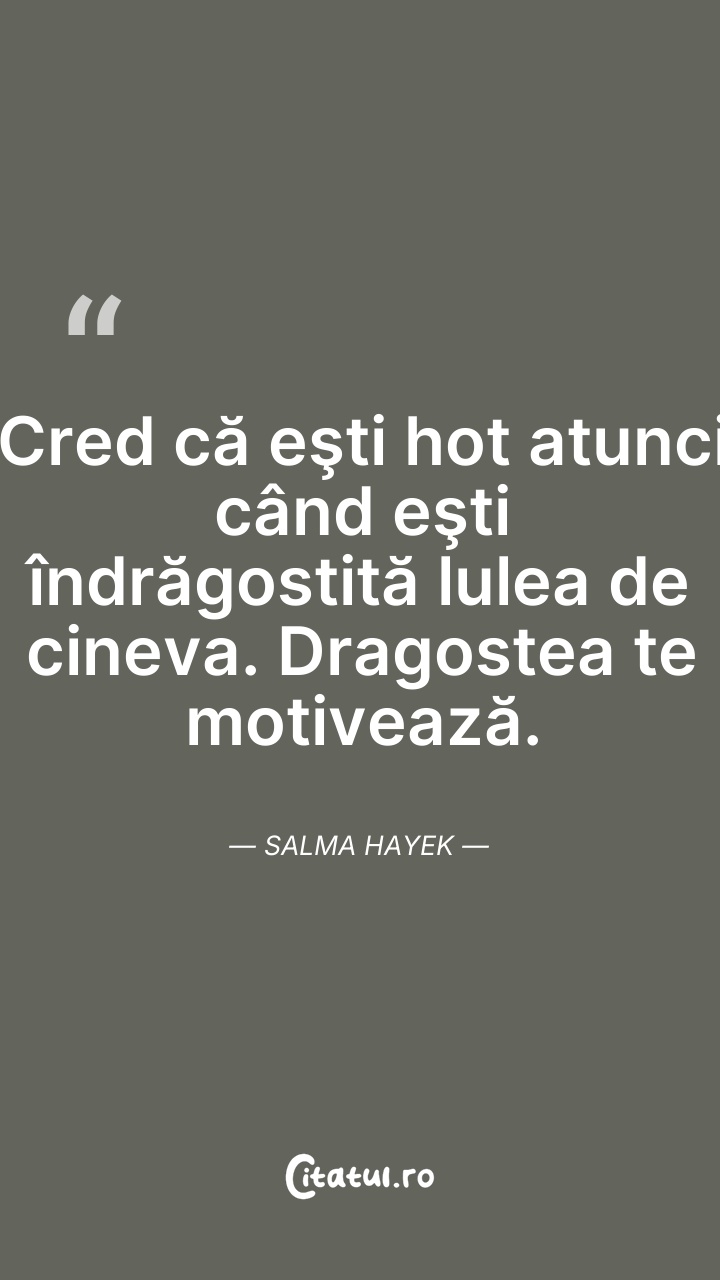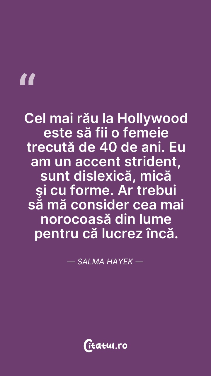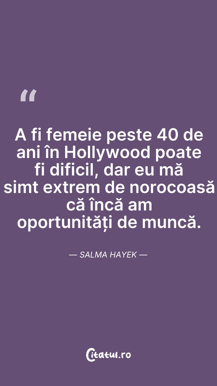 Salma Hayek Pinault este o actriță, regizoare și producătoare de film mexicană și americană. Ea și-a început cariera în Mexic, în telenovela Teresa, jucând apoi în filmul El Callejón de los Milagros, rol pentru care a fost nominalizată la Premiul Ariel. În 1991 Hayek s-a mutat la Hollywood, consacrându-se prin rolurile din Desperado (1995), Dogma (1999) și Wild Wild West (1999).